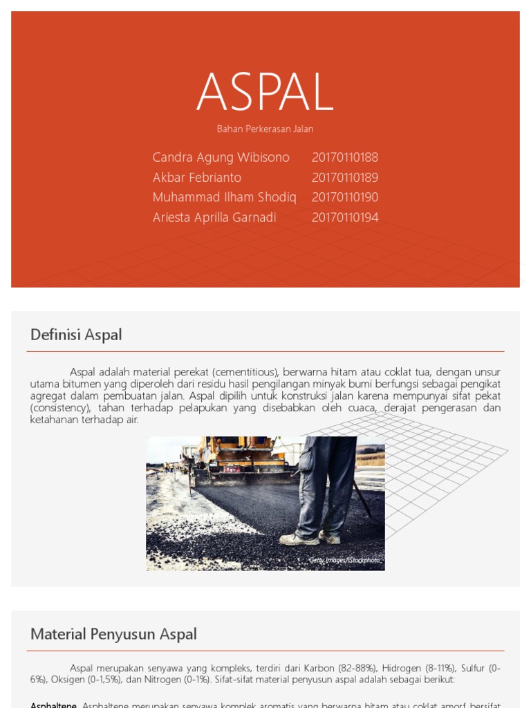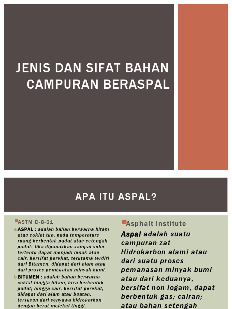 Pengujian Aspal Dan Agregat Perkerasan J from data03.123doks.com Daya ikat yang baik dari lapisan aspal. Aspal akan mengeras dan mengikat agregat pada tempatnya (sifat termoplastis) hidrocarbon adalah bahan dasar utama dari aspal yang umumnya disebut bitumen. Sehingga aspal sering juga disebut bitumen, aspal merupakan salah satu material konstruksi perkerasan lentur. Masters thesis, program pasca sarjana universitas diponegoro. View 2 aspal.pptx from teknik 1023 at haluoleo university. Bahan ikat aspal dimana lapisan tersebut memiliki sifat thermoplastis yang menjadikan lapisan beraspal sensitif terhadap temperatur. Sifat di atas menunjukkan bahwa aspal bisa mencair pada suhu tinggi dan kemudian memadat ketika pada suhu rendah. Aspal umumnya berasal dari salah satu hasil destilasi minyak bumi (aspal minyak) dan bahan alami (aspal alam), aspal minyak (aspal cemen) bersifat mengikat agregat pada campuran aspal beton dan memberikan lapisan kedap air.
