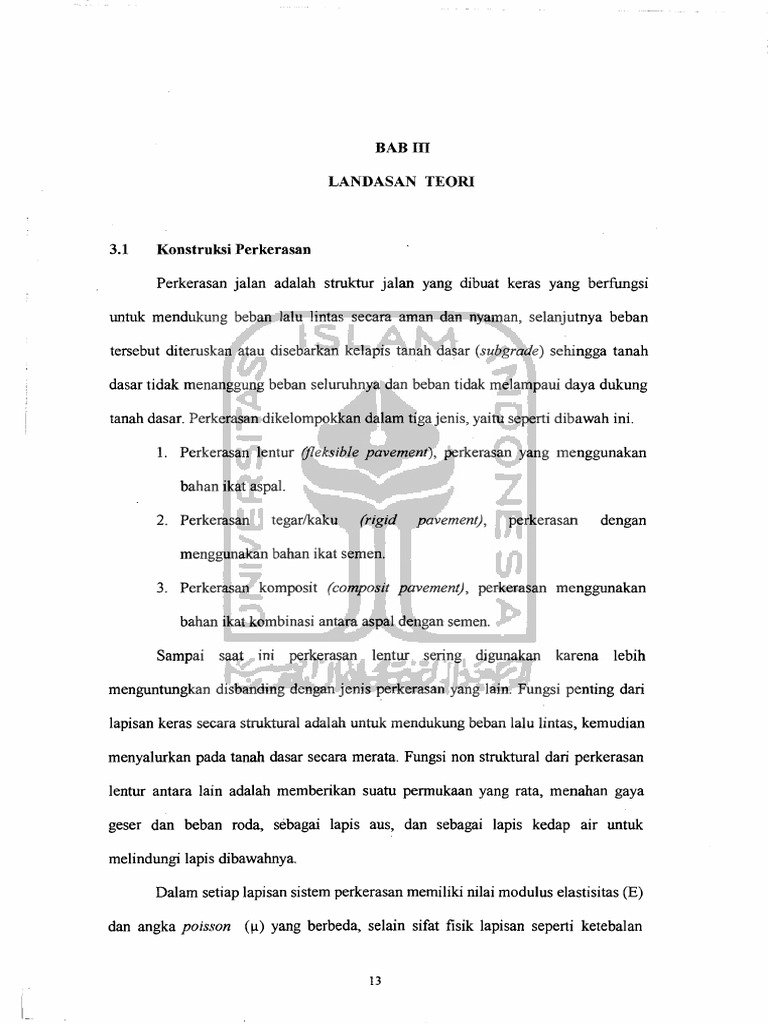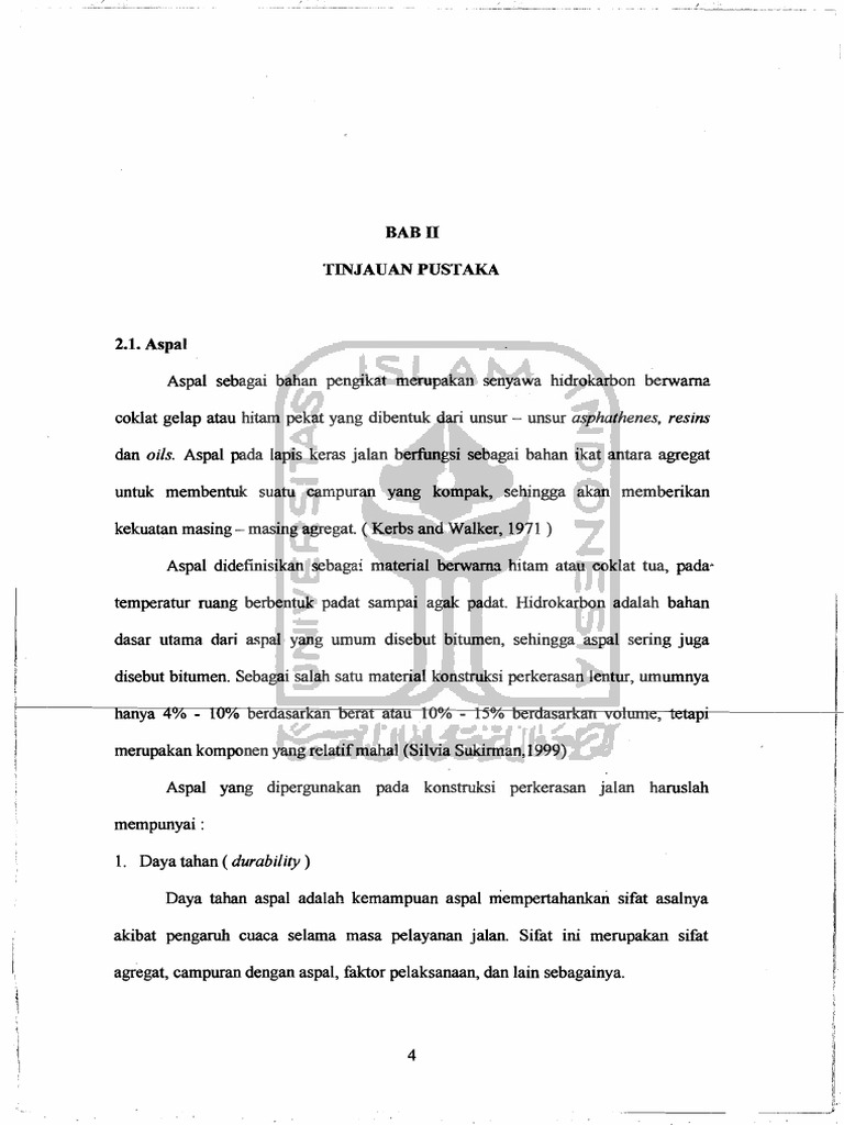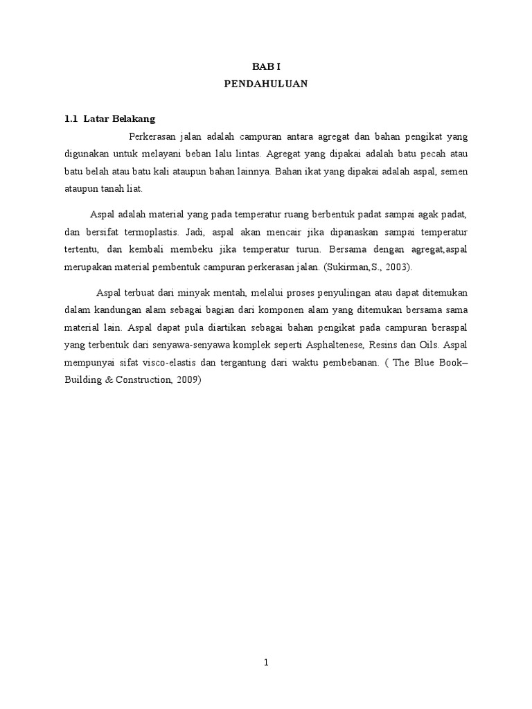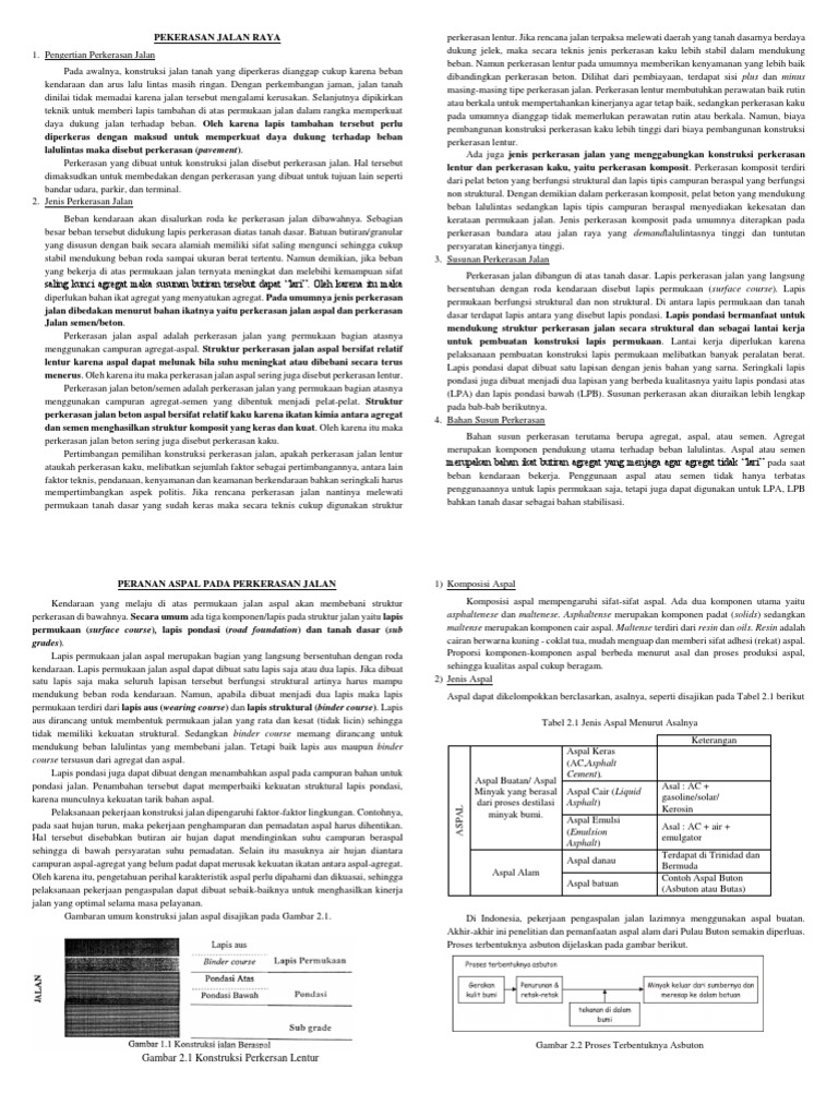 Perkerasan jalan pertemuan ke ii aspal p e ra n a n a s pa l pa d a p e r k e ra s a n ja l a n lapis permukaan jalan aspal merupakan Daktilitas yang tinggi mengindikasikan bahwa aspal semakin lentur, sehingga semakin baik digunakan sebagai bahan ikat perkerasan. Dengan bahan terdiri atas bahan ikat (berupa aspal, tanah liat) dan batu (hendra suryadharma, dkk, 1999). Sifat thermoplastic aspal adalah bahan thermoplastic yang konsistensinya (viskositasnya) berubah sesuai dengan perubahan temperatur. Penambahan aditif pada aspal menjadi alternatif yang dapat digunakan untuk mempertahankan maupun meningkatkan daya rekat, titik lembek, dan kelenturannya. Seiring dengan perkembangan ilmu perancangan tebal lapisan perkerasan yang mengarah pada penggunaan metoda. Salah satu penyebab penurunan kekuatan campuran pada perkerasan lentur adalah proses penuaan pada campuran aspal. Durabilitas kinerja aspal sangat dipengaruhi oleh sifat aspal tersebut setelah digunakan sebagai bahan pengikat dalam campuran beraspal dan dihampar dilapangan. Aspal umumnya berasal dari salah satu hasil destilasi minyak bumi (aspal minyak) dan bahan alami (aspal alam), aspal minyak (aspal cemen) bersifat mengikat agregat pada campuran aspal beton dan memberikan lapisan kedap air. Indonesia memiliki sumber aspal alam (di pulau buton, sulawesi), dengan deposit yang sangat besar dan potensial yang dapat dijadikan sebagai bahan untuk meningkatkan sifat reologi dari aspal minyak pen 60/70. Wahyudi, hemat (2002) evaluasi sifat marshall dan nilai struktural campuran beton aspal yang menggunakan bahan ikat aspal pertamina pen 60/70 dan aspal esso pen 60/70. Masters thesis, program pasca sarjana universitas diponegoro. Untuk memperoleh beton aspal campuran panas yang memenuhi persyaratan, salah satunya harus memperhatikan lamanya waktu pencampuran antara.