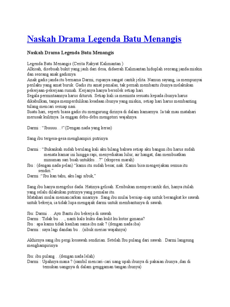 Naskah drama legenda batu menangis lagi pusing nyari ide buat naskah drama? Hiduplah seorang janda miskin bersama anak perempuannya. Menceritakan sinopsis cerita rakyat batu menangis dahulu kala terdapat sebuah desa terpencil yang terletak di daerah kalimantan barat. Batu menangis legenda dari kalimantan. Review pentalogi hikayat satria satria sejati karya hilal asyraf ( no spoiler!) husein rider.